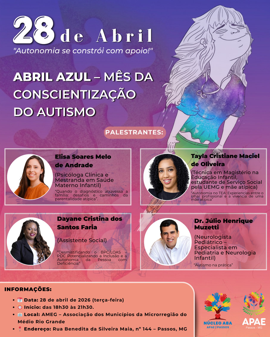 Em celebração ao mês do Autismo, a APAE Passos convida a comunidade para uma noite de conhecimento e troca de experiências no dia 28 de abril, às 18h30, na AMEG. O evento abordará o Transtorno do Espectro Autista (TEA) sob múltiplas perspectivas, discutindo desde o diagnóstico familiar e direitos sociais (BPC/LOAS) até a prática clínica e a construção da autonomia.