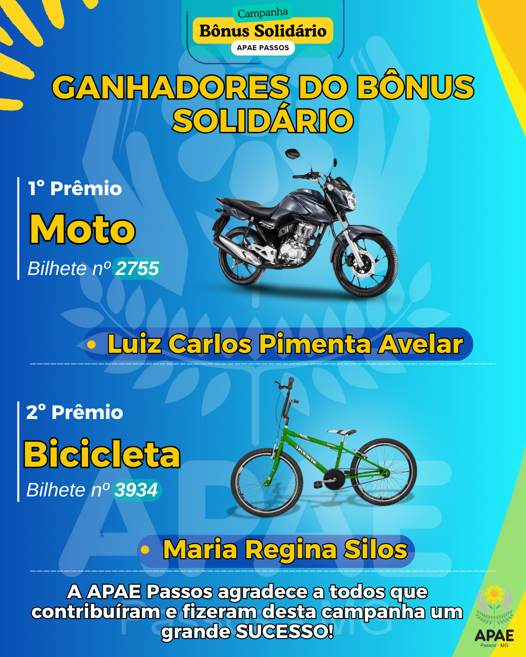 O sorteio do Bônus Solidário da APAE Passos, realizado em 27 de agosto de 2025, foi um grande sucesso! O 1º prêmio, uma Moto Honda 160, foi para Luiz Carlos Pimenta Avelar, e o 2º prêmio, uma Bicicleta, para Maria Regina Silos. Agradecemos a todos que apoiaram a campanha e contribuíram para o êxito da nossa causa.